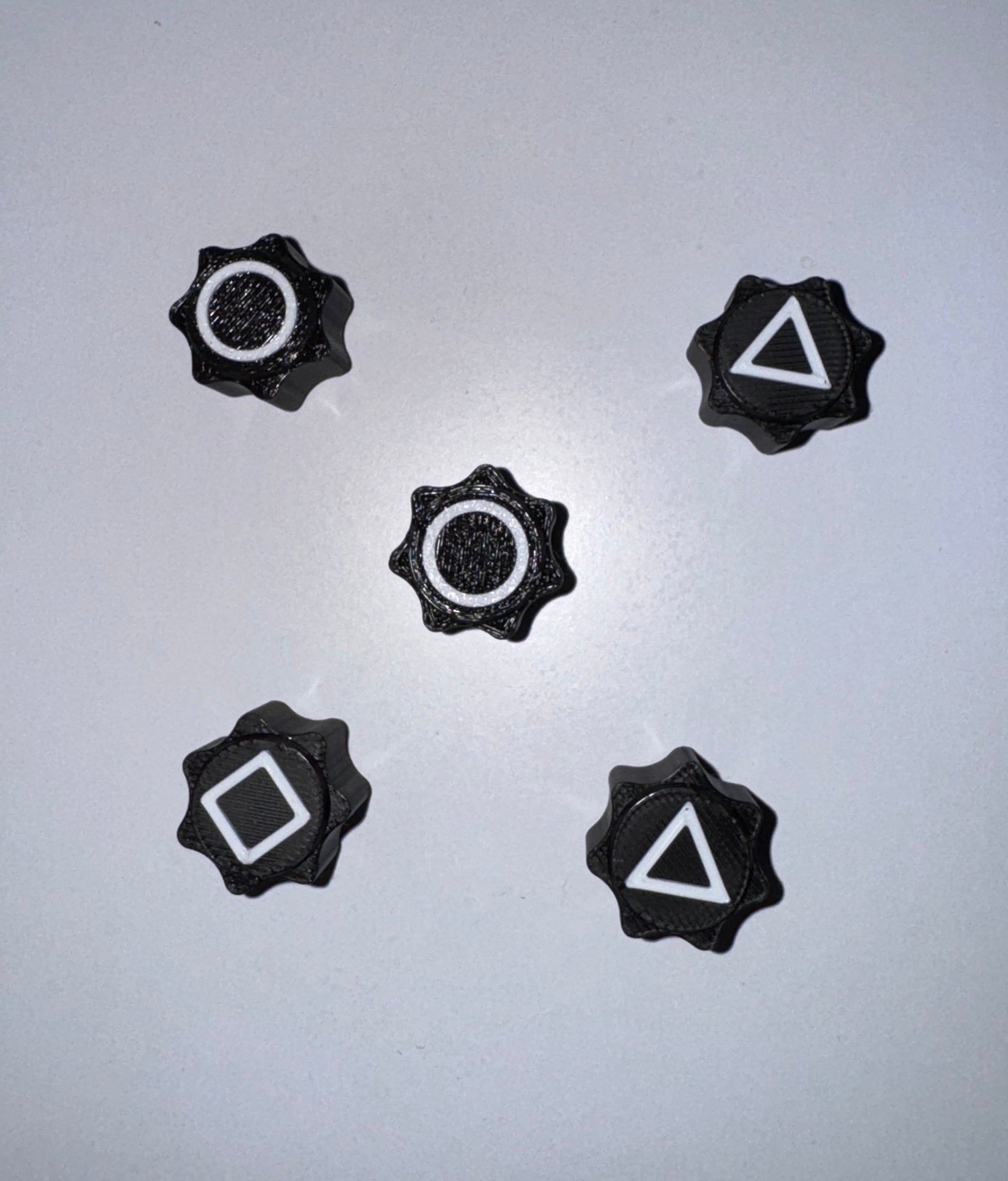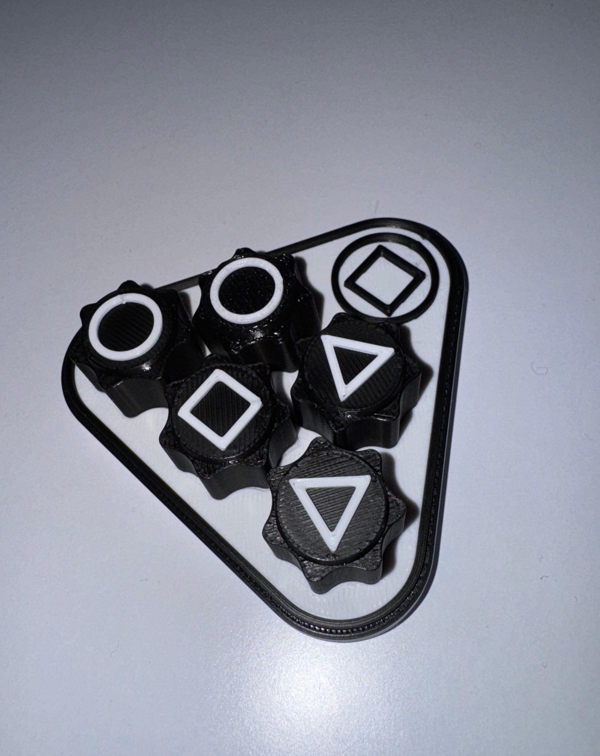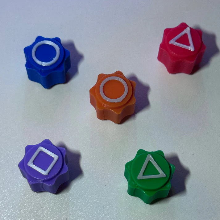 Dostępne kolory kości: Czerwony, Niebieski, Zielony, Fioletowy i Pomarańczowy. Kolory są losowe dobierane do 2 trójkątów, 2 okręgów i 1 prostokąta